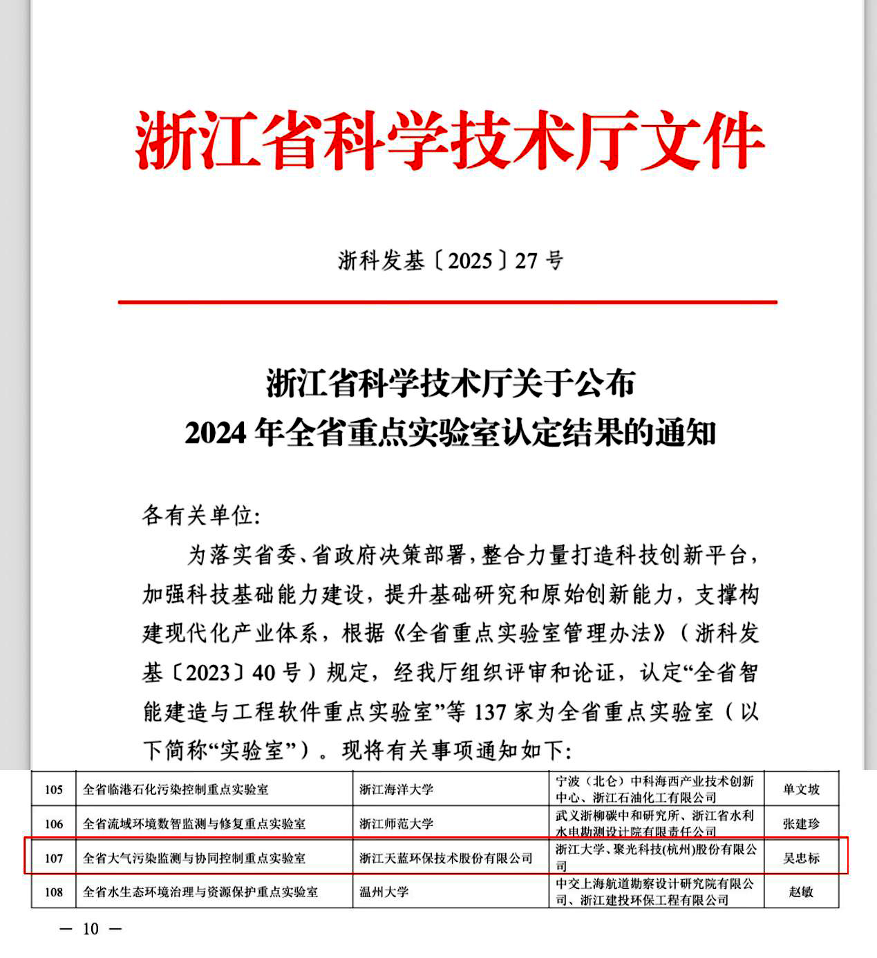 2025年6月4日,浙江省科技廳發(fā)布《浙江省科學(xué)技術(shù)廳關(guān)于公布2024 年全省重點(diǎn)實(shí)驗(yàn)室認(rèn)定結(jié)果的通知(浙科發(fā)基〔2025〕27號(hào))》,由浙江天藍(lán)環(huán)保技術(shù)股份有限公司牽頭,浙江大學(xué)和聚光科技(杭州)股份有限公司共建的“全省大氣污染監(jiān)測(cè)與協(xié)同控制重點(diǎn)實(shí)驗(yàn)室”獲批組建,成為全省環(huán)境領(lǐng)域唯一以企業(yè)牽頭建設(shè)的省級(jí)重點(diǎn)實(shí)驗(yàn)室
